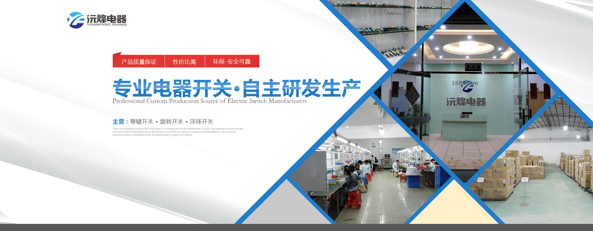 佛山市順德區(qū)沅烽電器有限公司是一家自主研發(fā)及生產(chǎn)各種電器開(kāi)關(guān)以及接線端子座企業(yè),產(chǎn)品主要有浮球開(kāi)關(guān)、琴鍵開(kāi)關(guān)、旋轉(zhuǎn)開(kāi)關(guān)、微動(dòng)開(kāi)關(guān)、按鍵開(kāi)關(guān)等系列,產(chǎn)品廣泛應(yīng)用在空調(diào)、電風(fēng)扇、電飯煲、電暖器、電烤箱、微波爐、榨汁機(jī)、攪拌機(jī)等家電行業(yè)。 本公司提供產(chǎn)品從設(shè)計(jì)開(kāi)發(fā)到制造檢驗(yàn)及跟蹤服務(wù)的全部流程,自主擁有模具設(shè)計(jì)制造、自動(dòng)沖壓、精密注塑成型及組裝等部門(mén)。公司不斷完善檢測(cè)體系并引進(jìn)高精度檢測(cè)儀器,其中有被美國(guó)安全試驗(yàn)檢驗(yàn)公司即UL公司認(rèn)可的安規(guī)實(shí)驗(yàn)室。 本公司于2003年通過(guò)并實(shí)施ISO9001國(guó)際品質(zhì)管理認(rèn)證體系,產(chǎn)品相繼獲得CQC、CE、TUV、UL認(rèn)證,同業(yè)內(nèi)眾多知名企業(yè)如美的、TCL、海信科龍、格蘭仕等保持長(zhǎng)期的合作關(guān)系,有部分產(chǎn)品出口多個(gè)國(guó)家。 我們堅(jiān)持走專(zhuān)業(yè)化的道路,以一流的產(chǎn)品及服務(wù)答謝客戶,愿與各界朋友共創(chuàng)美好明天...        查看更多